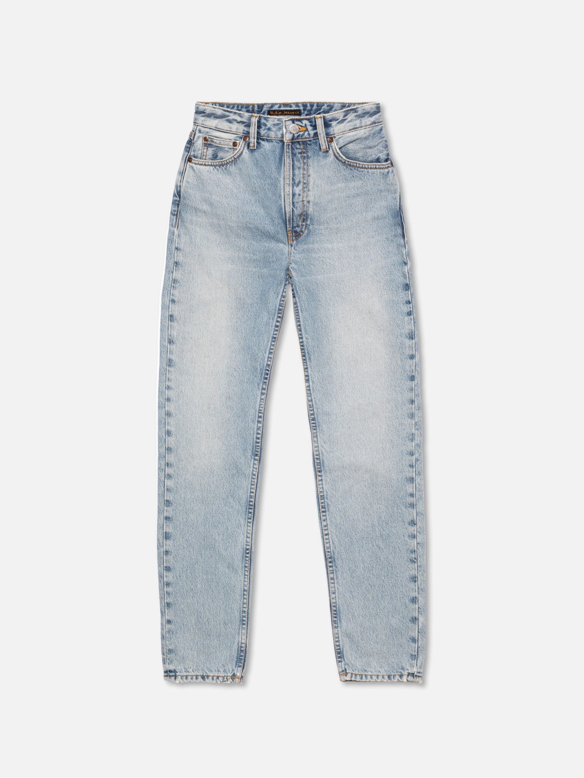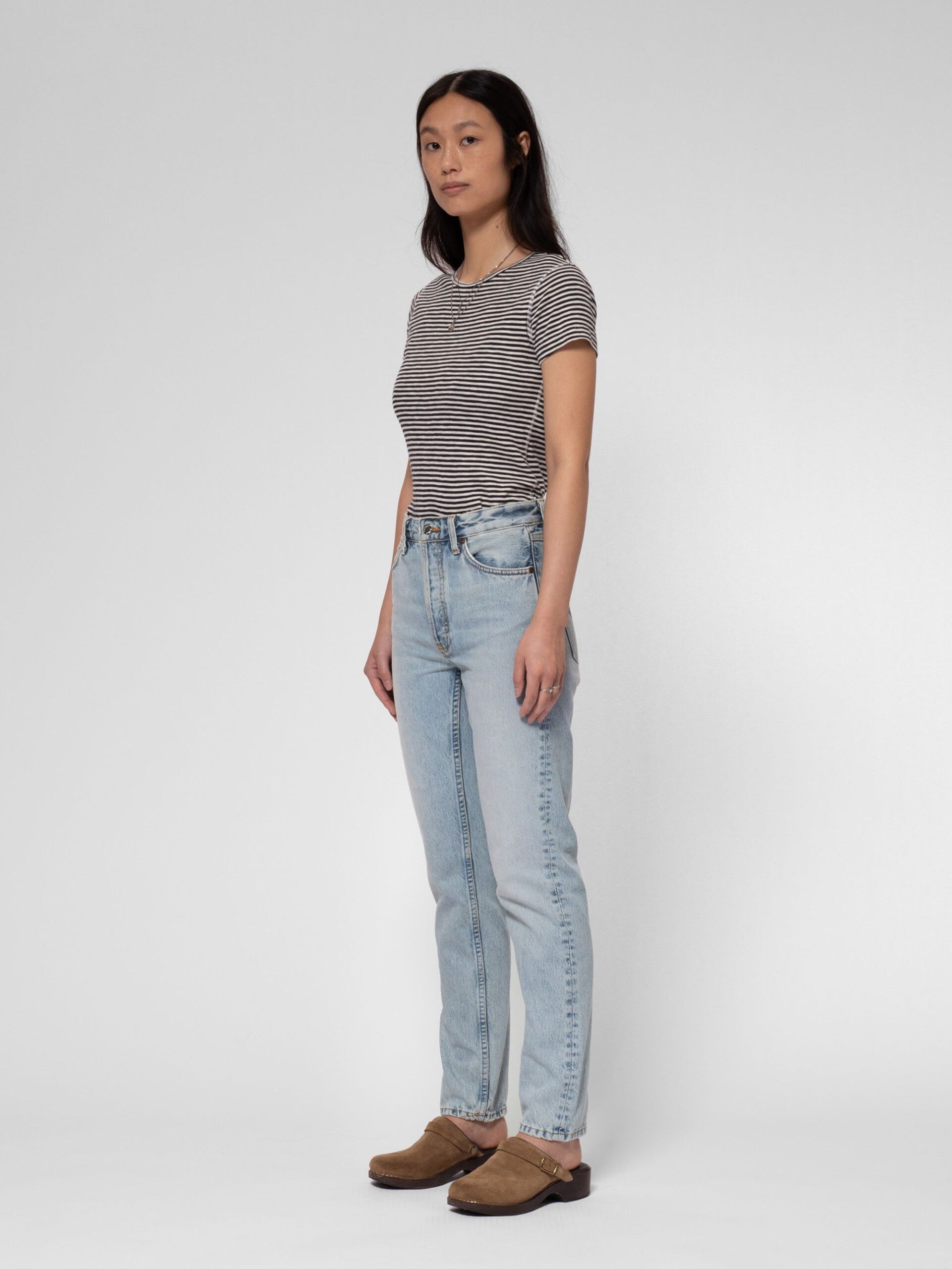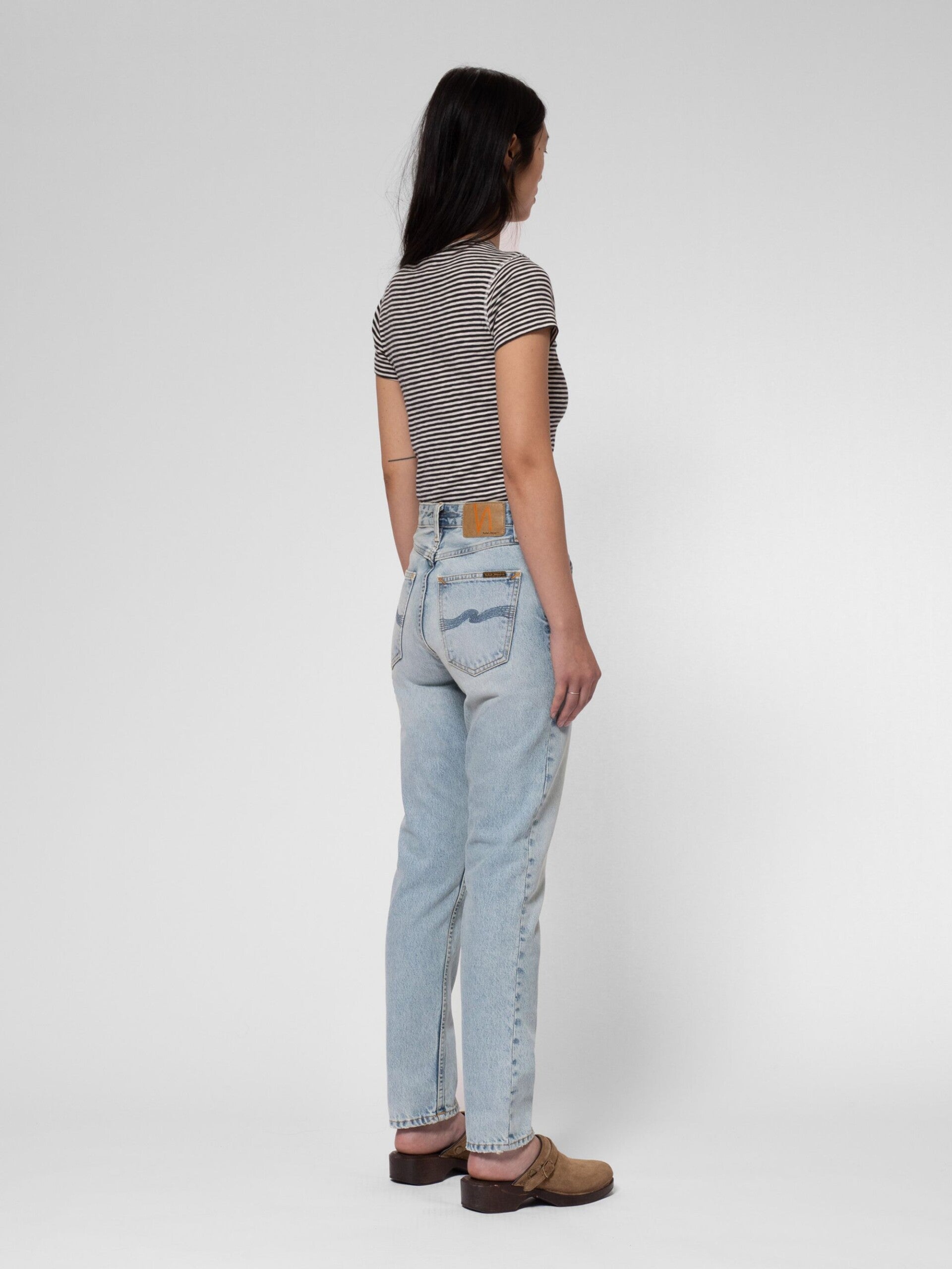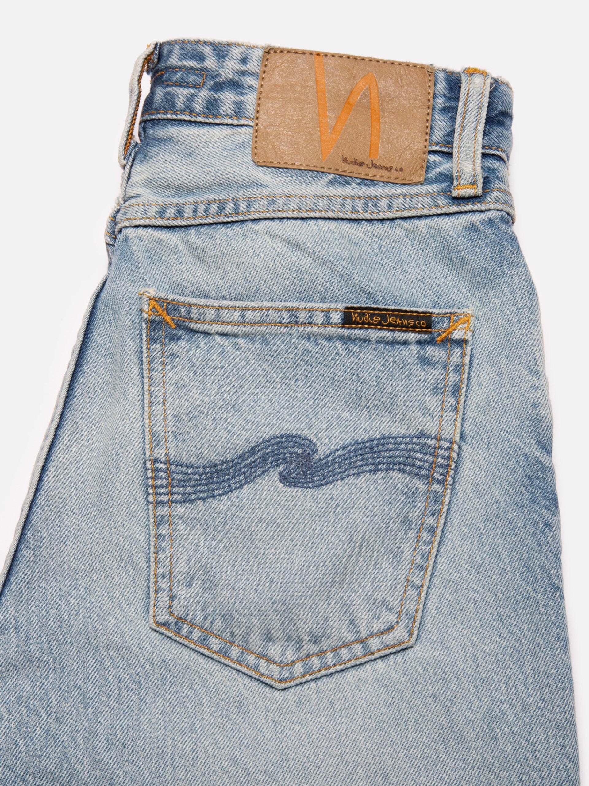 Jeans zonder stretch van het merk Nudie Jeans. De jeans valt hoog in de taille en kort op de enkel (lengte 30) en kan zowel oversized als fitted gedragen worden.