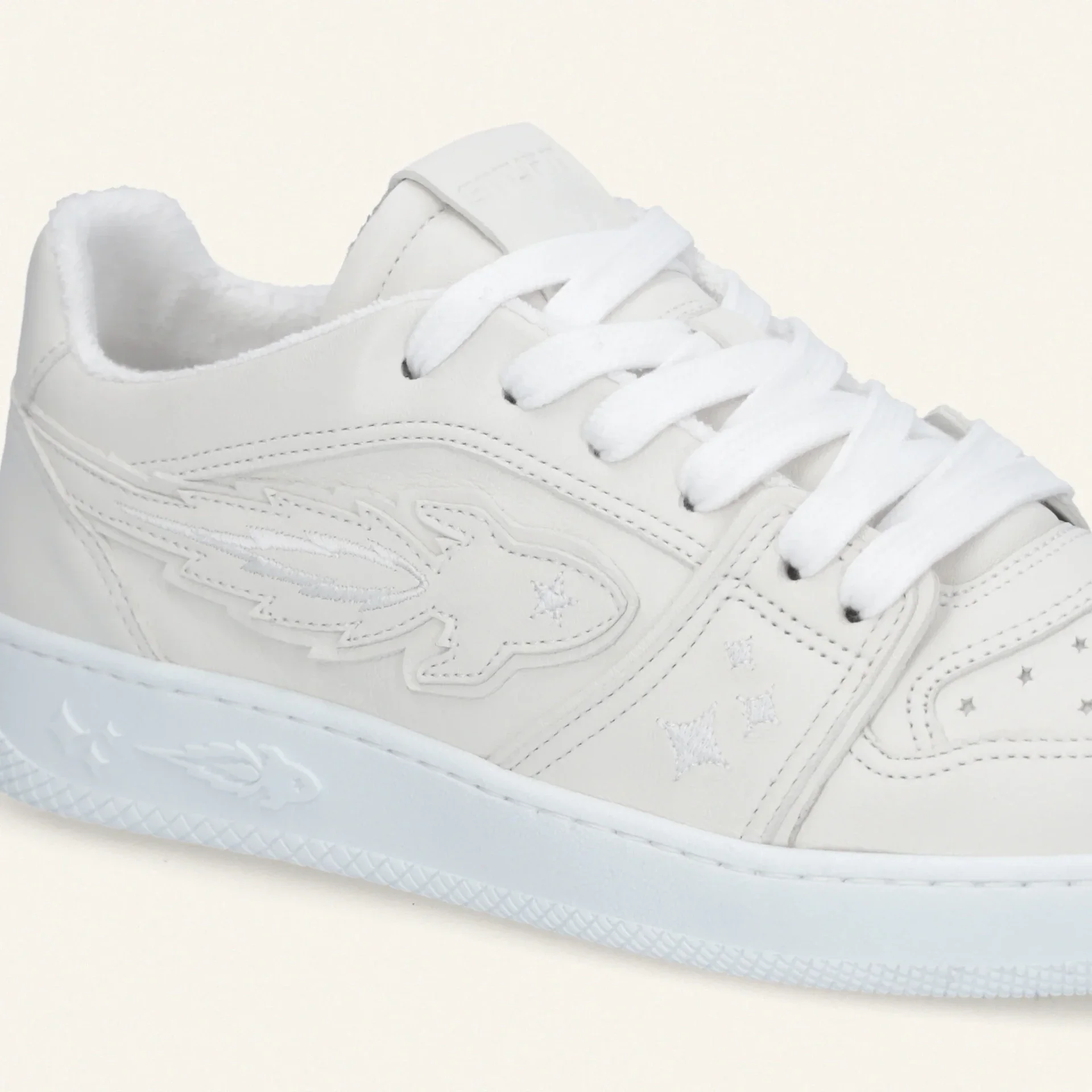 Lage sneaker van wit leer van het Italaiaanse merk Eterprise Japan. De sneakers worden in Italië gemaakt.