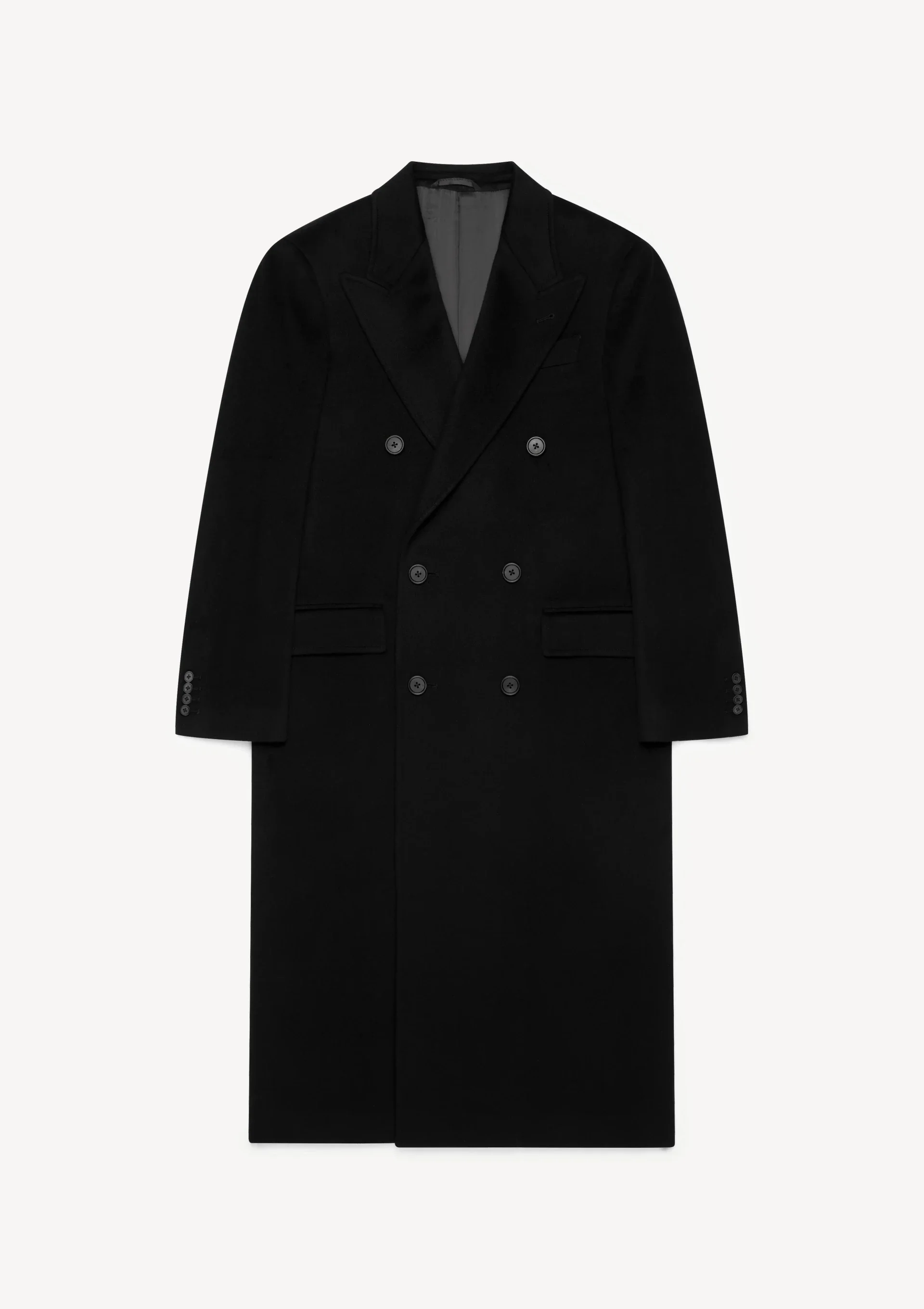 Lange zwarte mantel van het Nederlandse merk Herman. De jas i gemaakt van 90% wol en 10% kasjmier.