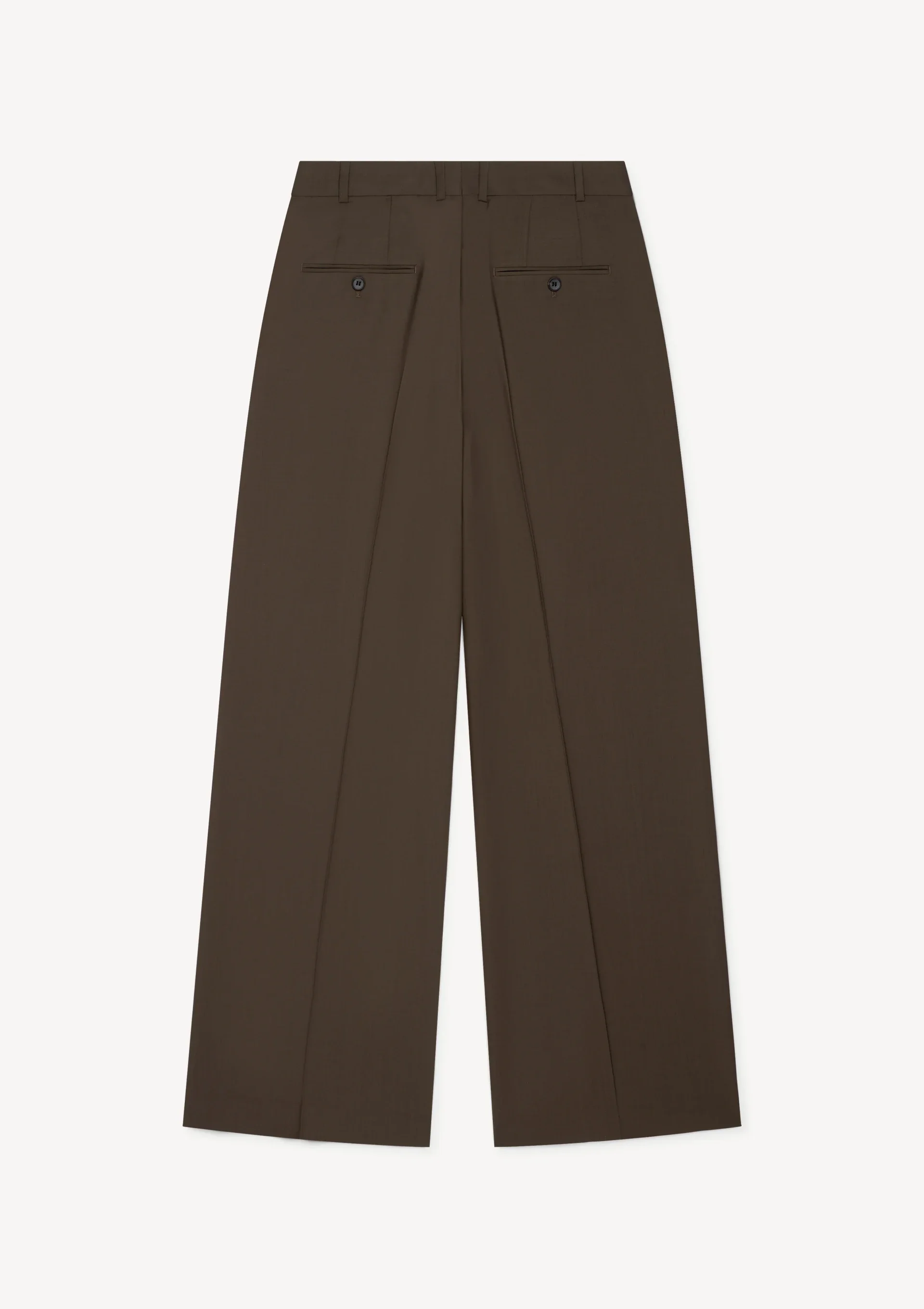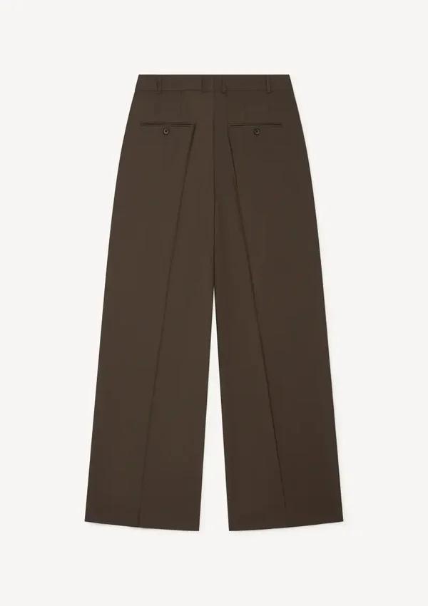 Donkerbruine pantalon met dubble bandplooi gemaakt van wol. Er is een matchende blazer beschikbaar.