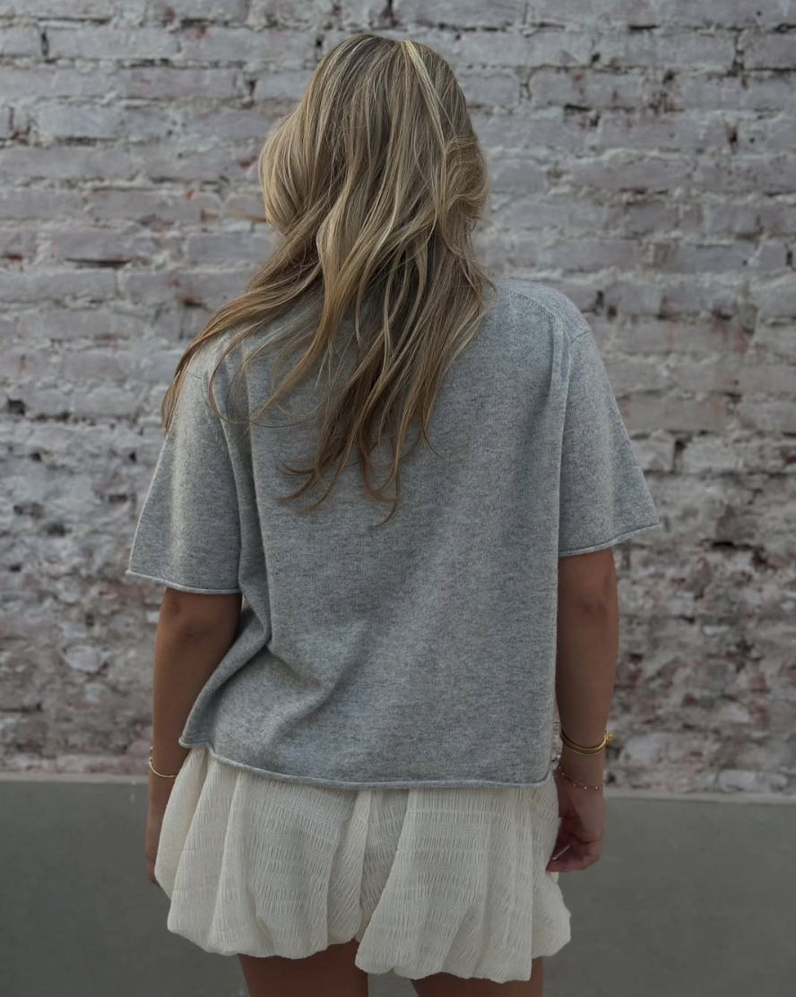 T-shirt van L'âme de Julie, gemaakt van 100% premium kasjmier in een light grey melange-tint en de comfortabele, boxy pasvorm is dit de perfecte mix van luxe en modern gemak.