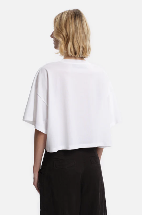Kort wit t-shirt met logo van het merk Margaux Lonnberg. De maten vallen ruim/oversized.