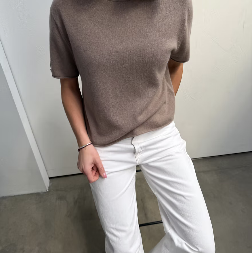 T-shirt van L'âme de Julie, gemaakt van 100% premium kasjmier in de kleur truffel. Door de comfortabele, boxy pasvorm is dit de perfecte mix van luxe en modern gemak.